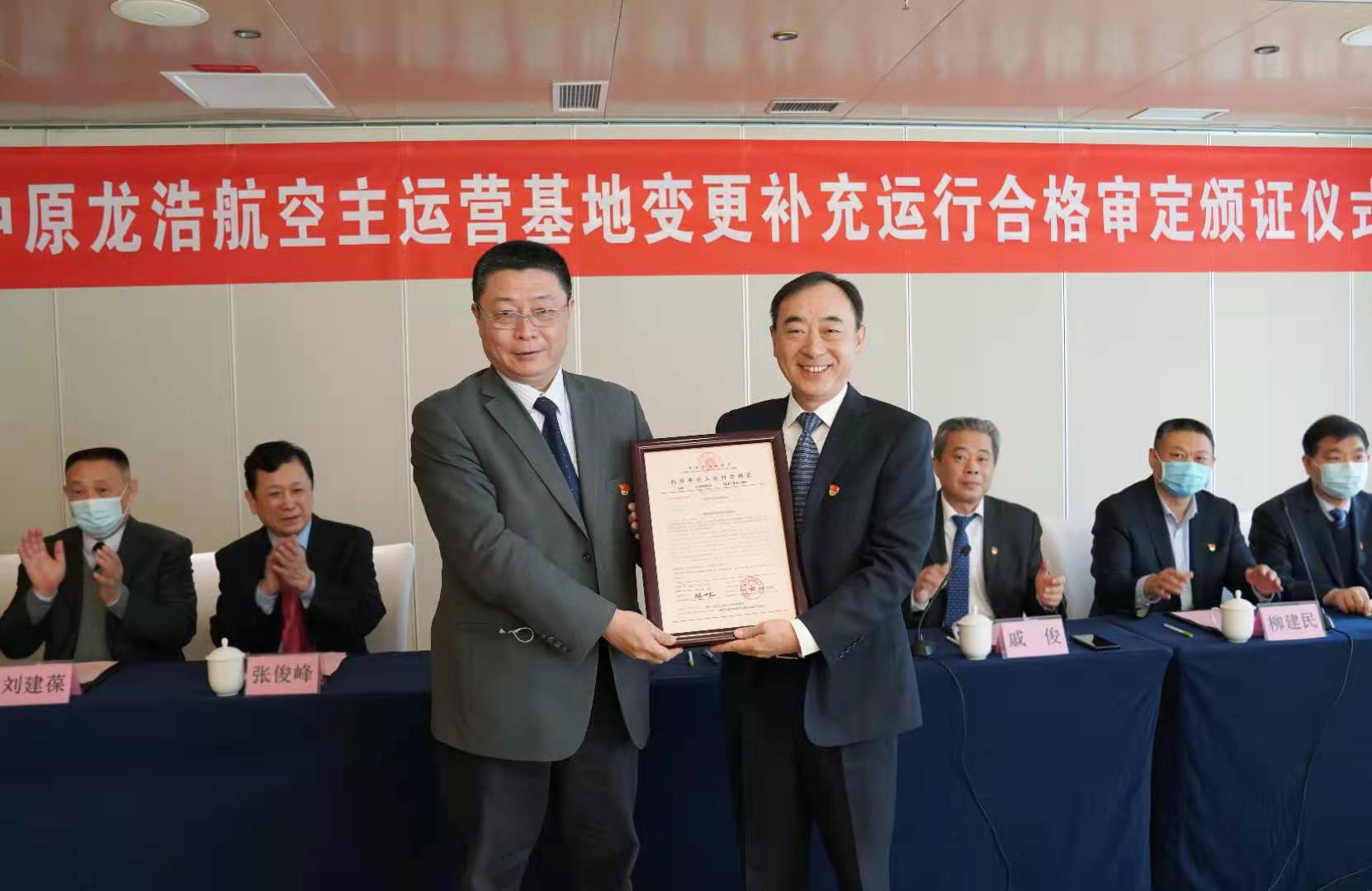 民航中南局向中原龍浩頒發主運營基地變更運行合格證